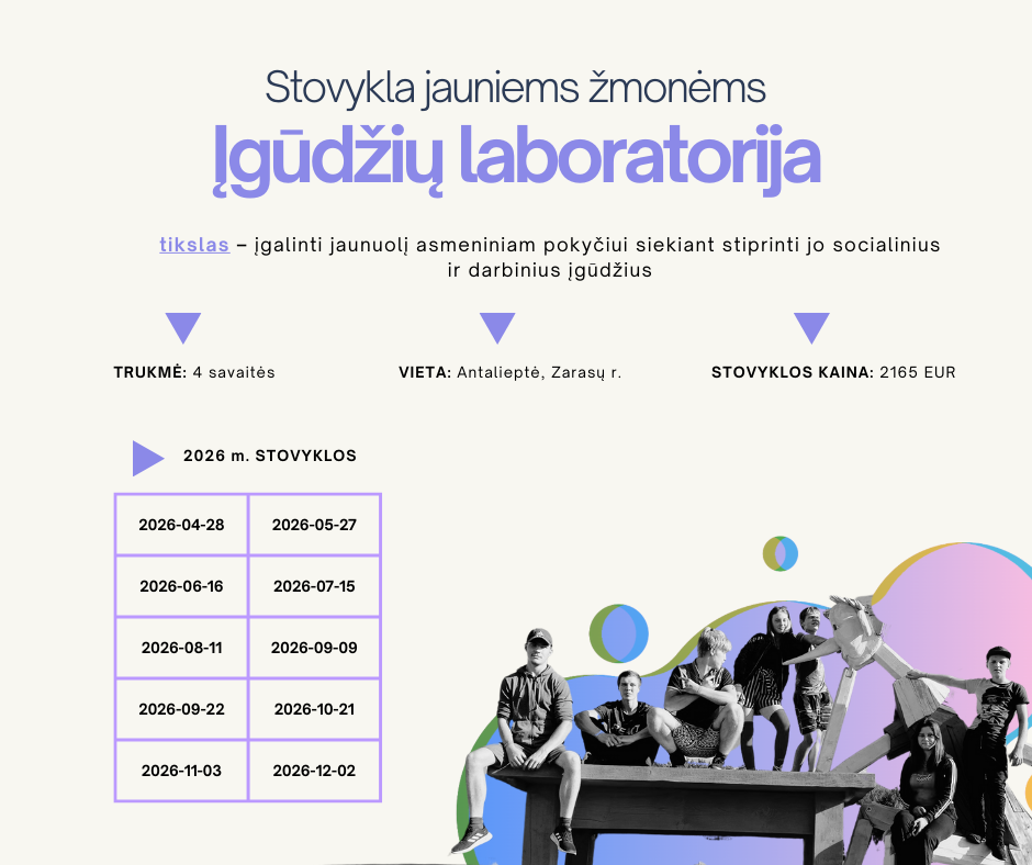 Įgūdžių laboratorija – tai mėnesio laiko trukmės stovykla sunkumus patiriantiems jauniems žmonėms. Stovyklos metu, pakeitus įprastą aplinką, sulaukus paramos iš specialistų ir ugdant socialinius bei darbinius įgūdžius jaunuoliai yra įgalinami reikšmingiems pokyčiams jų gyvenime.